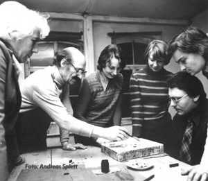 Bild links: Meinolf Splett in der Lithografiedruckwerkstatt des Verbandes Bildender Künstler